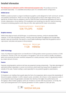 Graphics Engine: H200 BUS: NVIDIA NVLink Memory size: 1128 GB Memory type: HBM3e Theoretical performance: 536 TFLOP